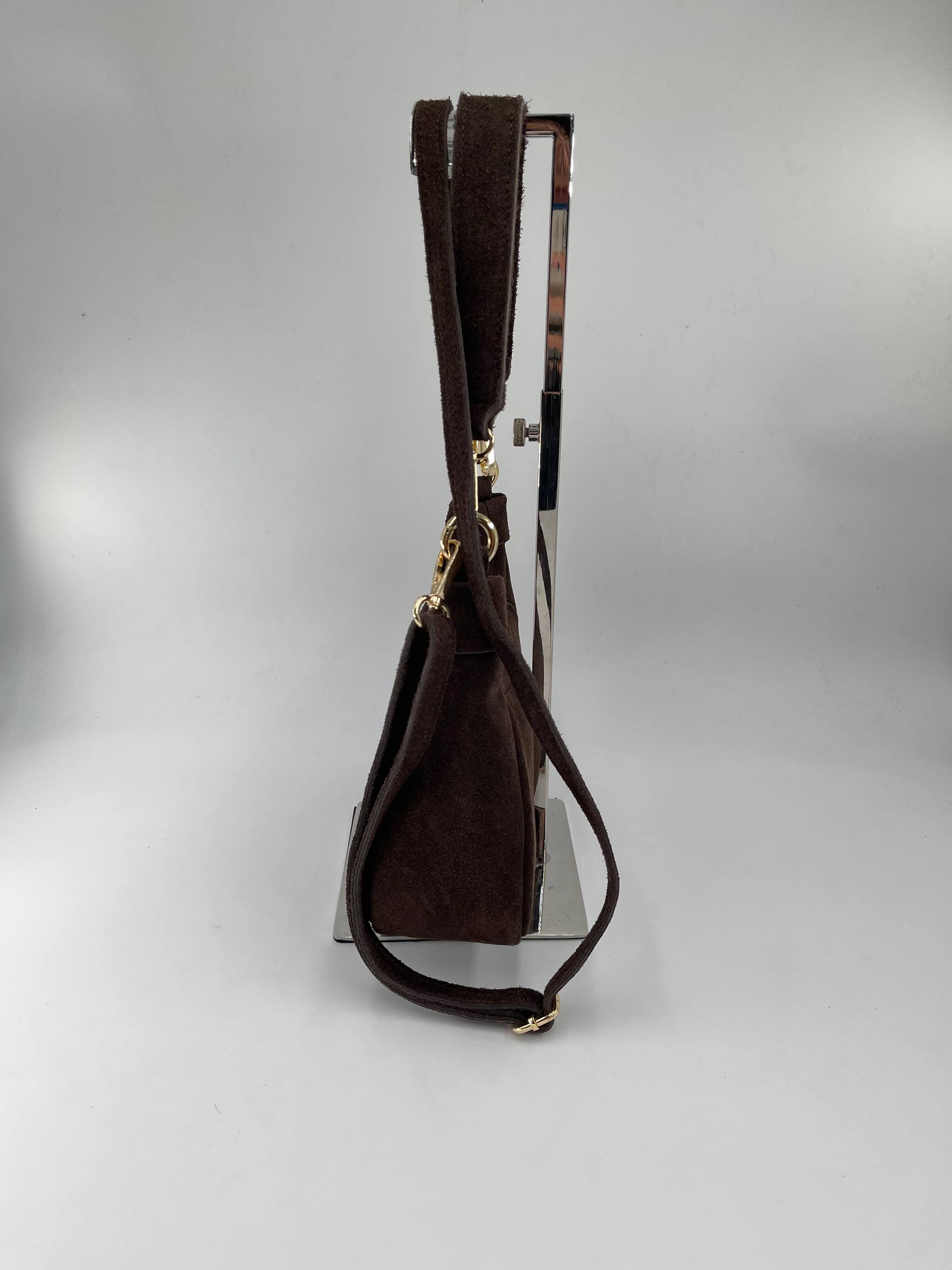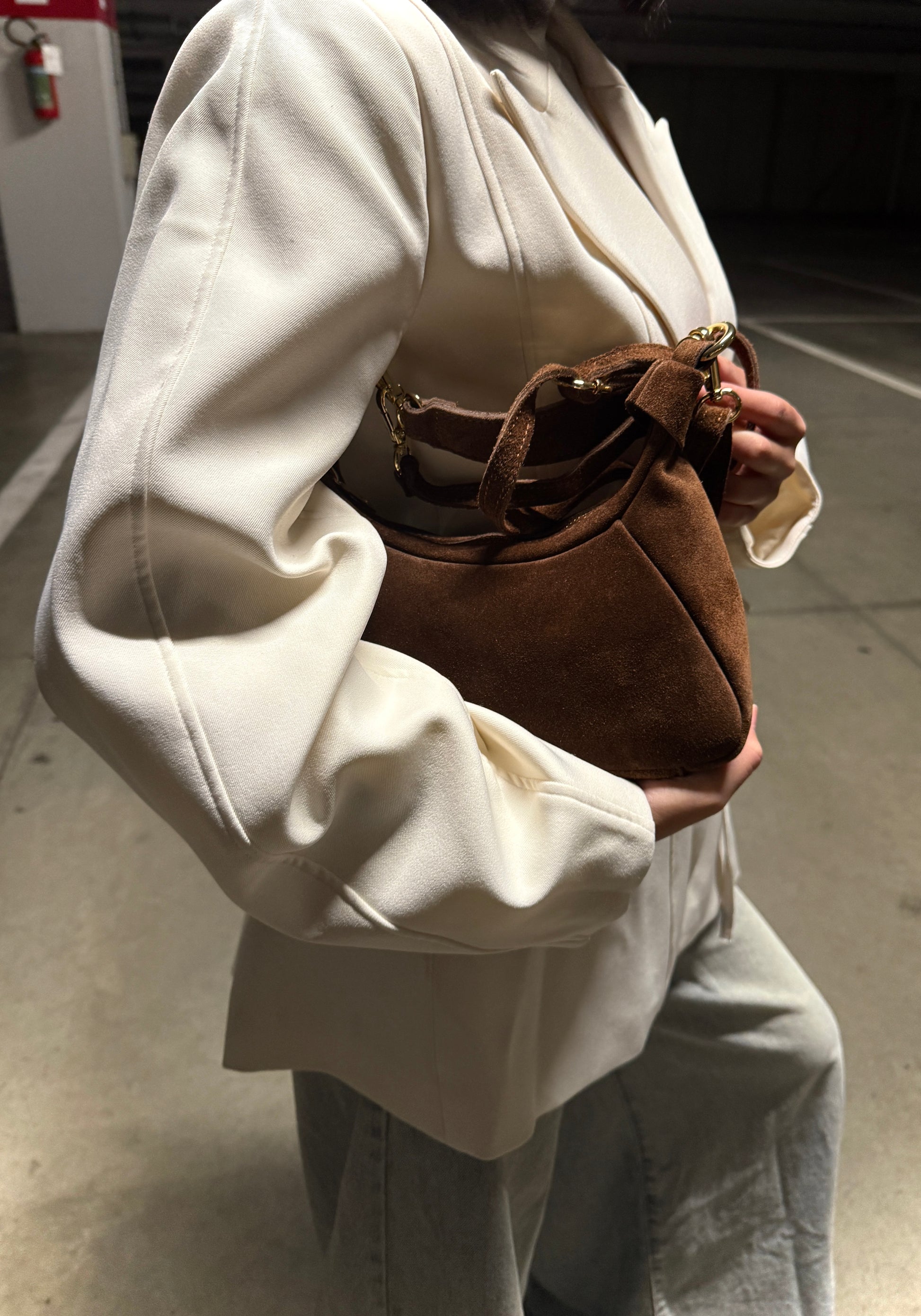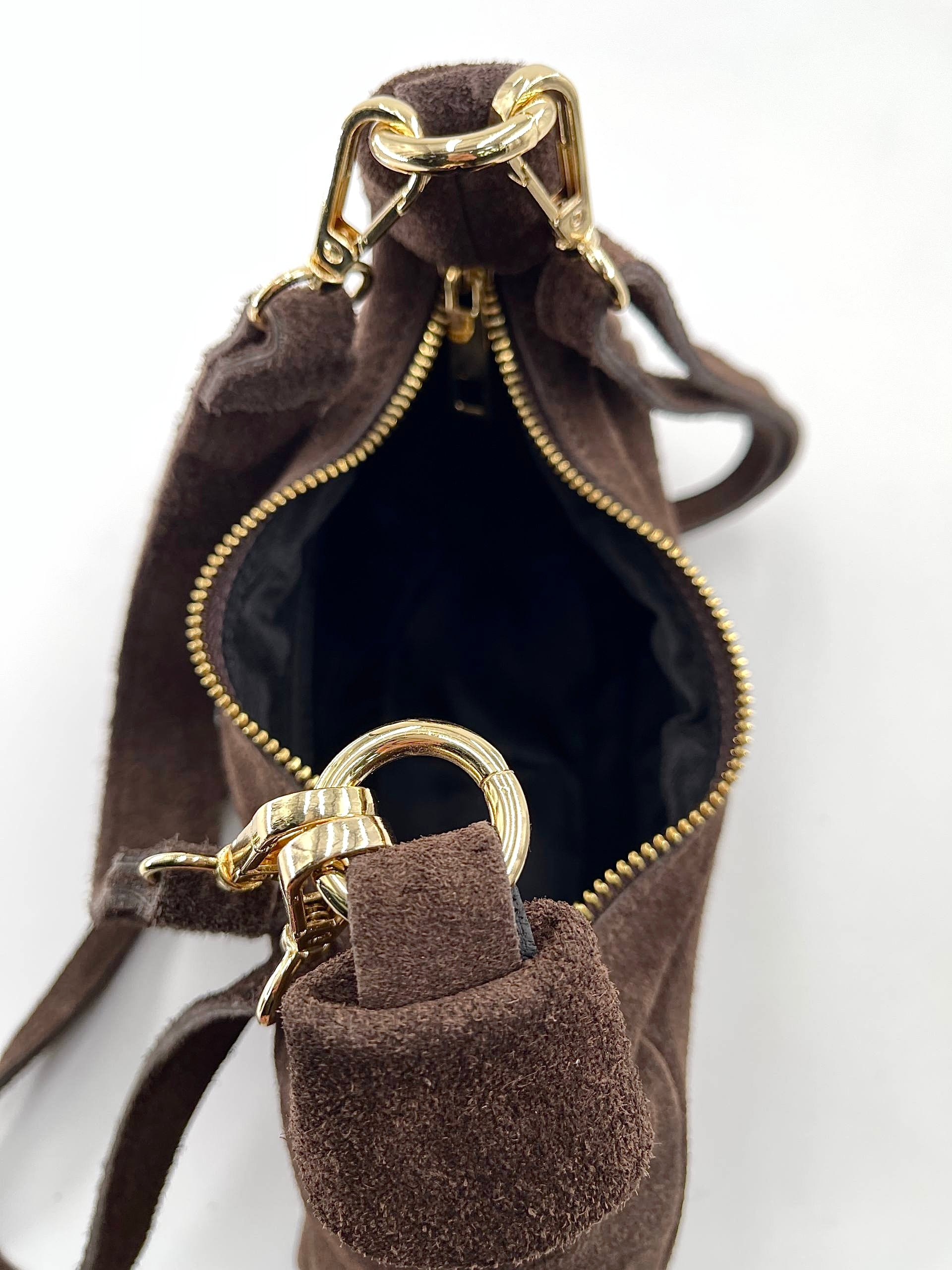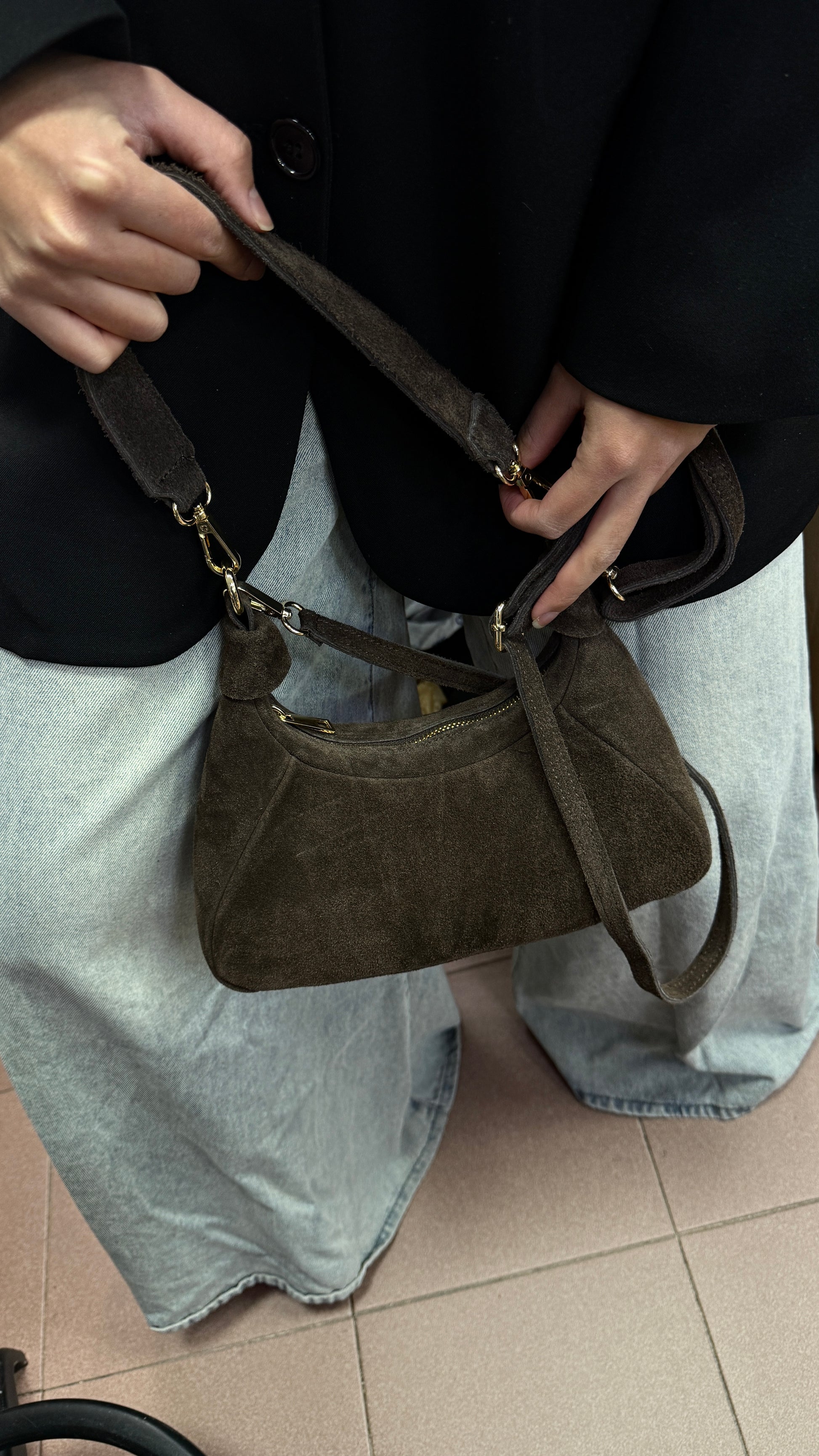 This elegant silhouette is designed to move with you from dawn till dusk. Its generous size effortlessly holds your tablet, wallet, cosmetic pouch, and more, all while maintaining a refined, curved profile. The rich, soft suede and Made in Italy quality ensure enduring sophistication. Wear it on your shoulder or across the body—your daily dose of intentional, intuitive style.