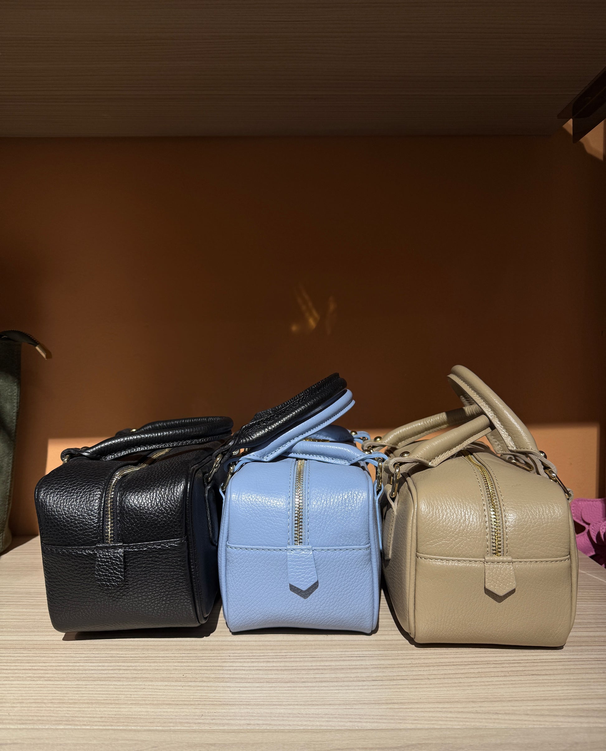 Designed to accompany every moment of your day, this compact duffle bag is the perfect ally for those who demand function without compromising on style. Its dimensions are perfectly suited for daily essentials (wallet, phone, keys, makeup), all while maintaining an impeccably structured profile. The authentic Italian pebbled leather and Made in Italy craftsmanship ensure unparalleled durability and a feeling of subtle luxury. Carry it by hand for a polished, professional look or wear it hands-free with the strap—your timeless touch of elevated style.